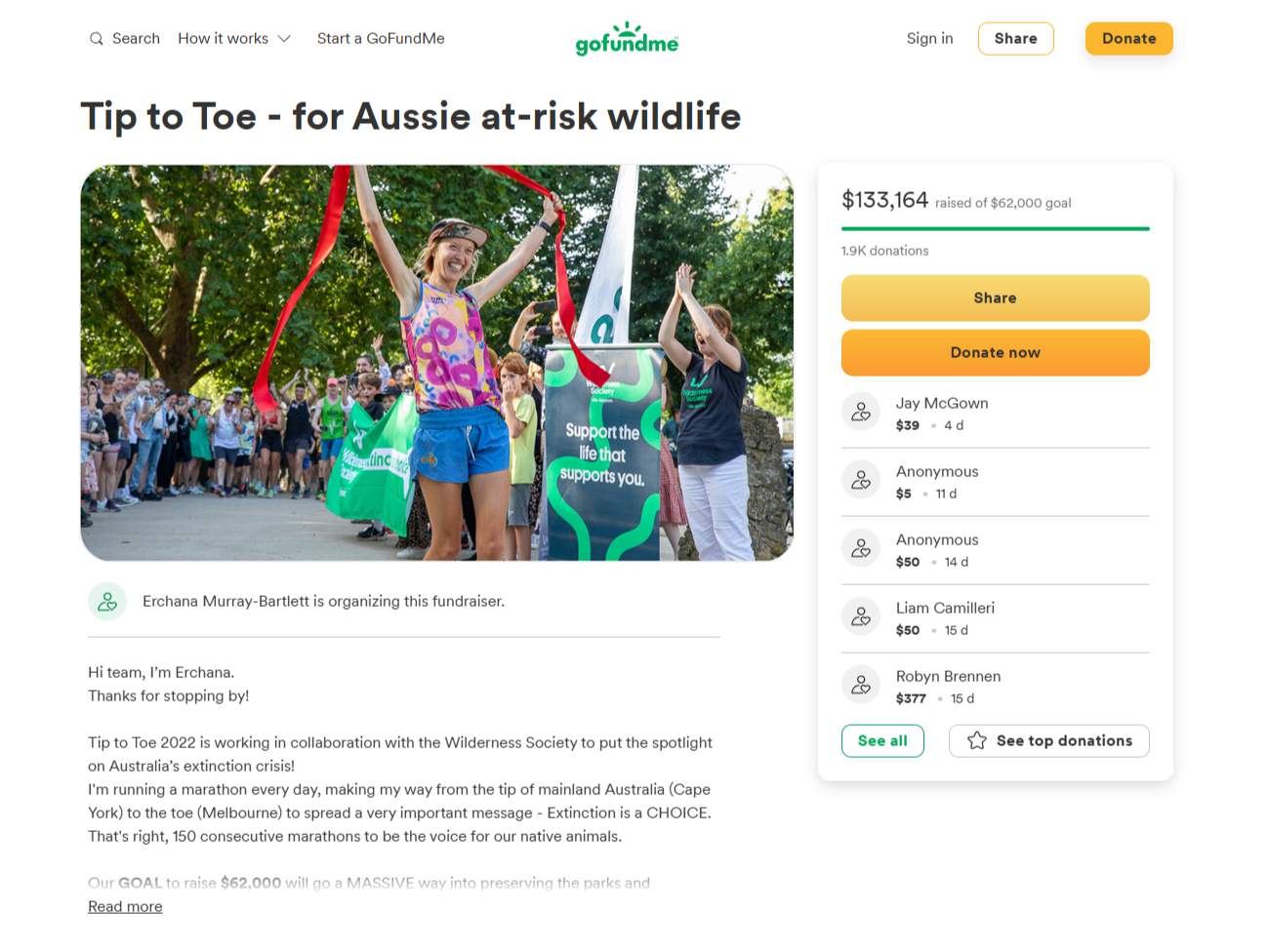 Project: Tip to Toe 2023About: Working with the Wilderness Society, Erchana Murray-Bartlett ran 150 marathons in 150 days to break a world record and raise money for Australian nature. I assisted with social and content for the campaign, which was covered globally by media outlets including the BBC, CNN, The Times, The Guardian, Der Spiegel and many more.URL: Campaign Link