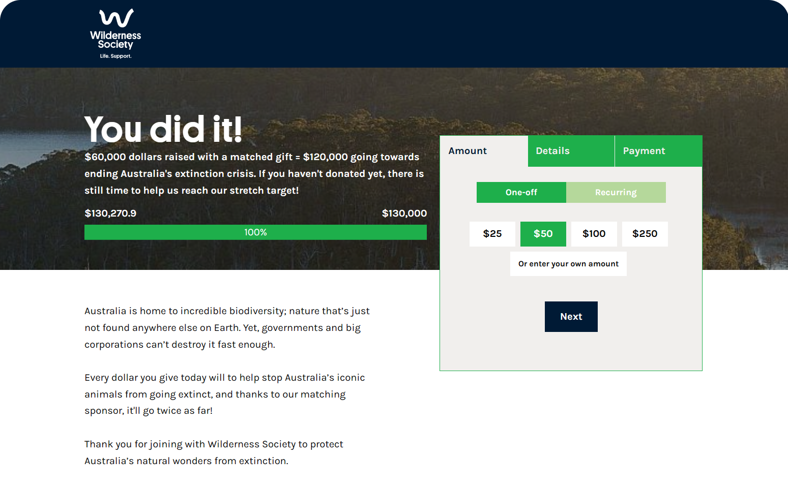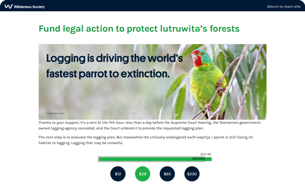 Project: Mt. Tongatabu Court CaseAbout: We raised $25,000 in a day to fund a court case investigating the legalities of a logging operation in lutruwita / Tasmania.URL: Appeal LinkURL: Post LinkAd ROI: 3.58