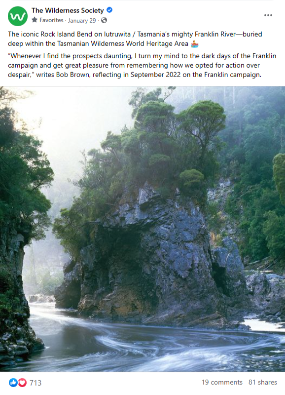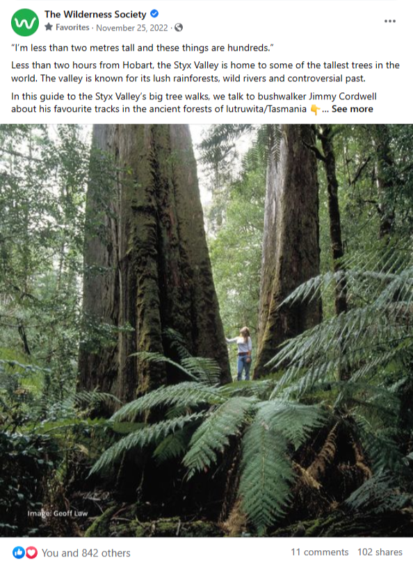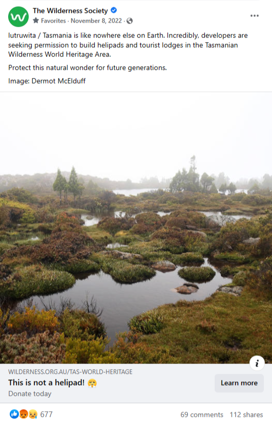 Project: 2022 Holiday AppealAbout: The Wilderness Society's annual end of year digital appeal – this year focusing on the Tasmania Wilderness World Heritage Area and inappropriate development. We raised over $130,000 in one day of the campaign with the help of a matching sponsor. I developed and ran the social media component of the campaign – sample social ads below.URL: Campaign Link